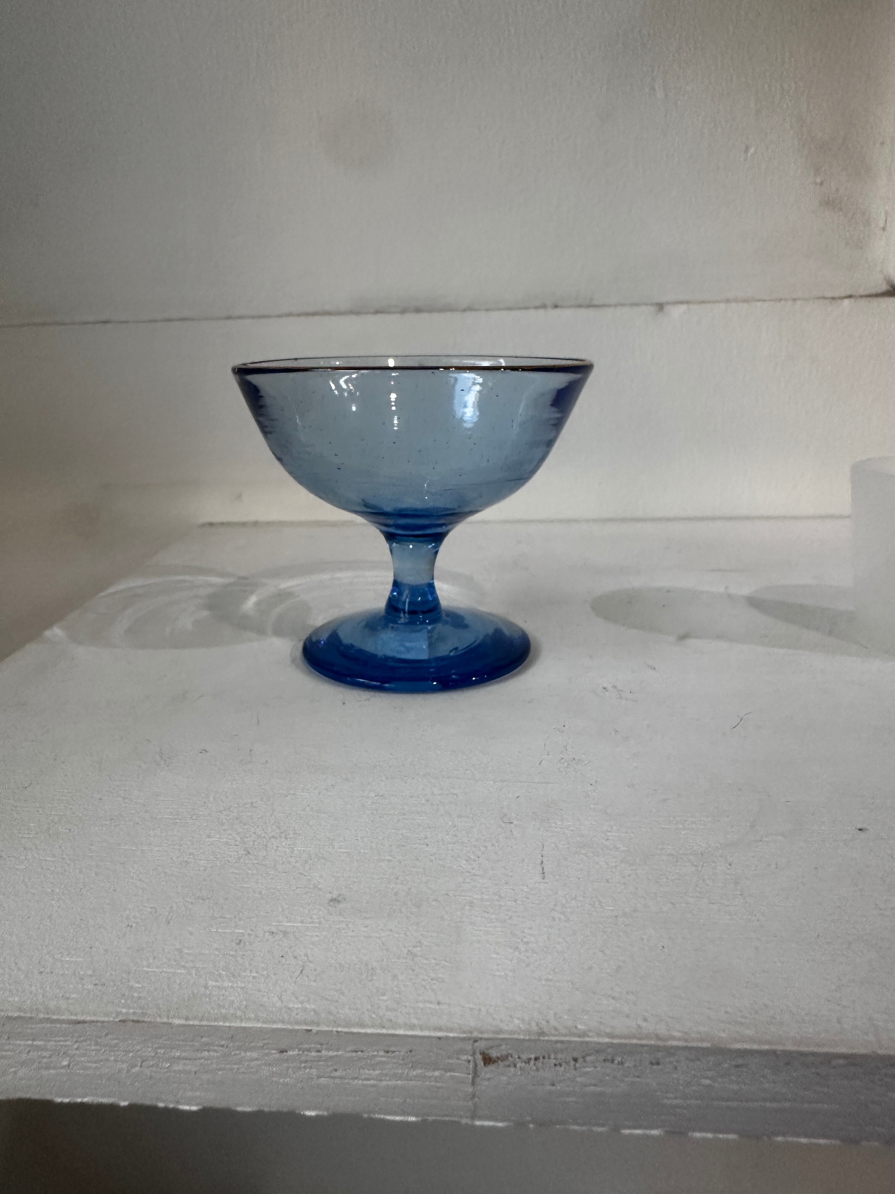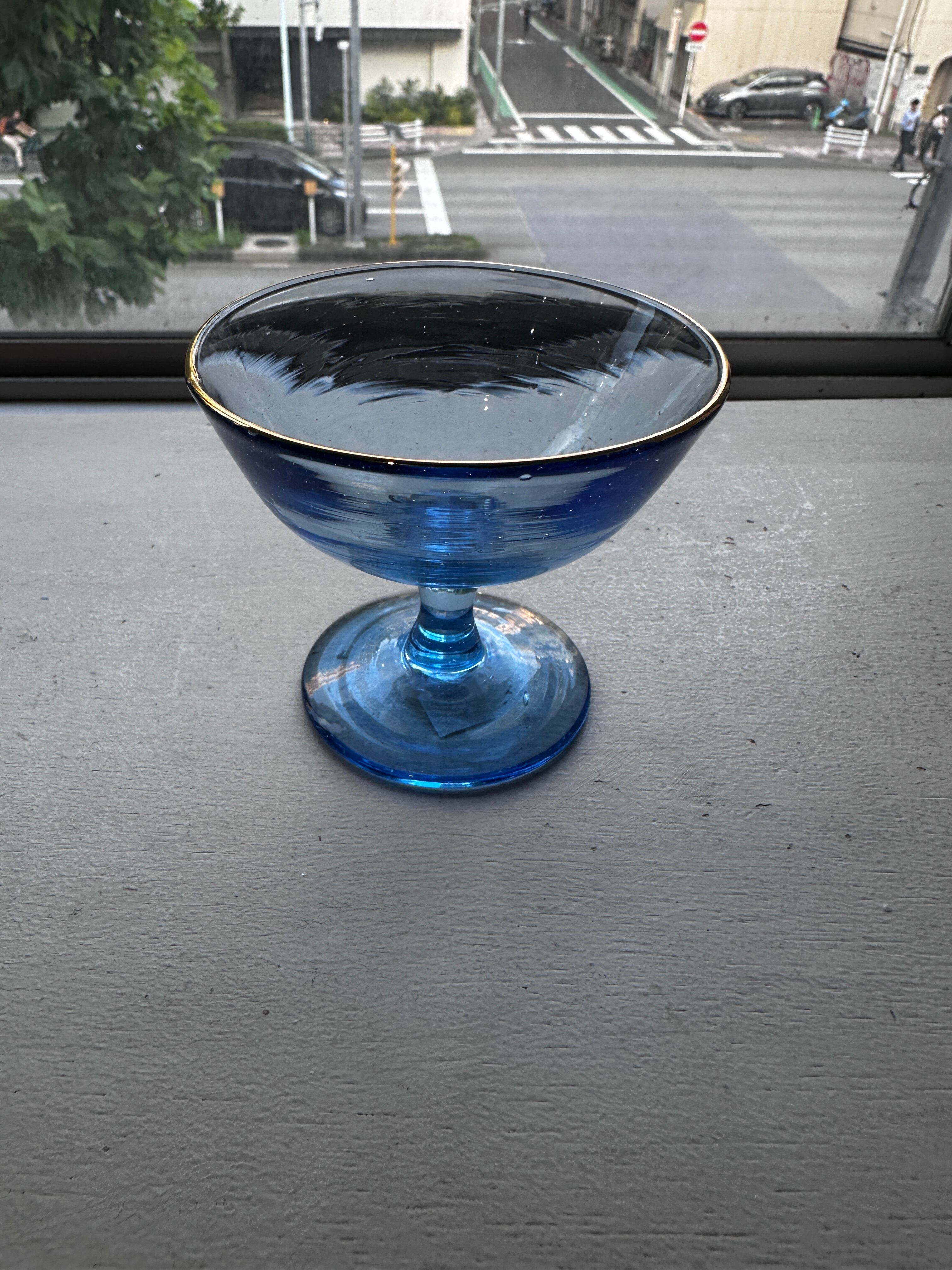 青い小さい足付きグラスの応援に金彩を施したもの