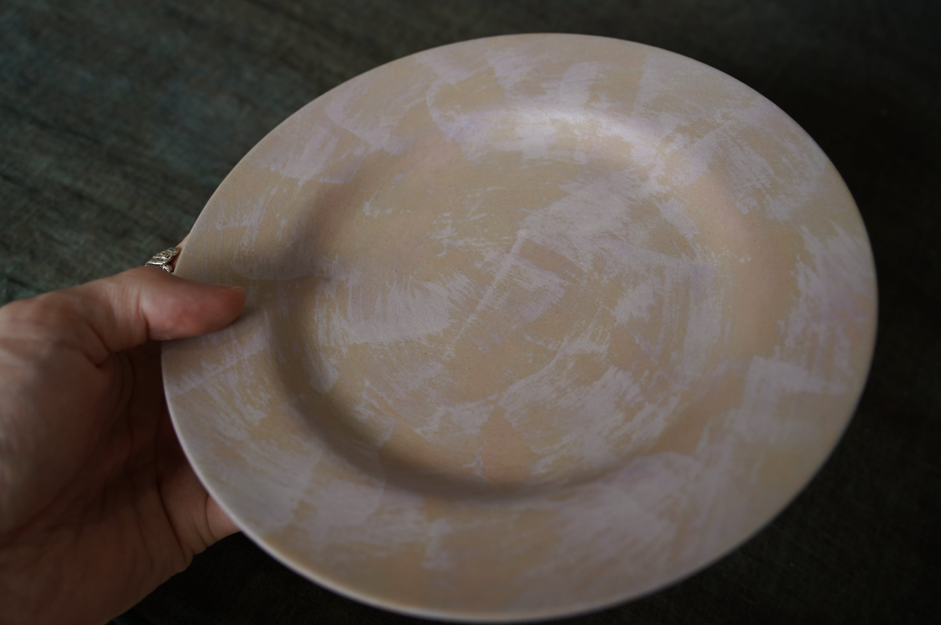 磁器の上に釉薬、化粧土、上絵を何層にも重ねることによって生み出される曖昧な色味は、陽の光によって移ろう霞がかった空のようです。