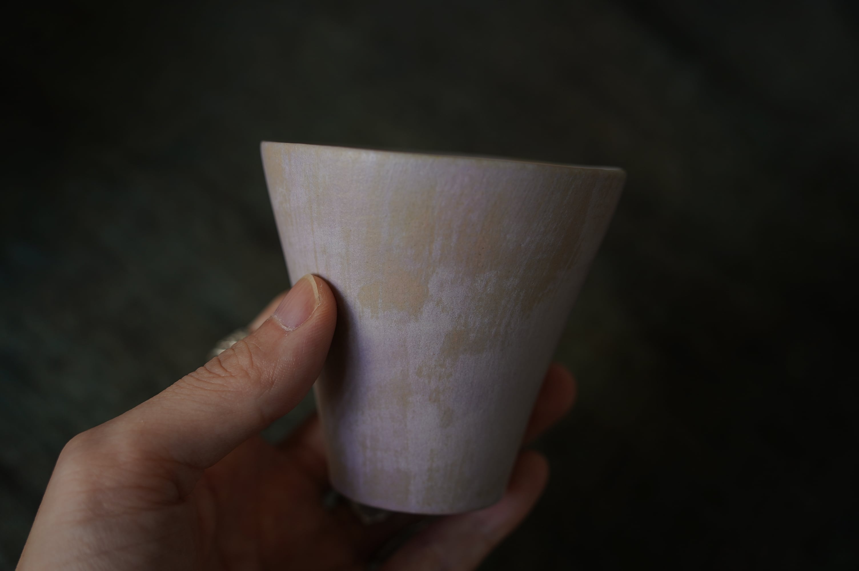 磁器の上に釉薬、化粧土、上絵を何層にも重ねることによって生み出される曖昧な色味は、陽の光によって移ろう霞がかった空のようです。