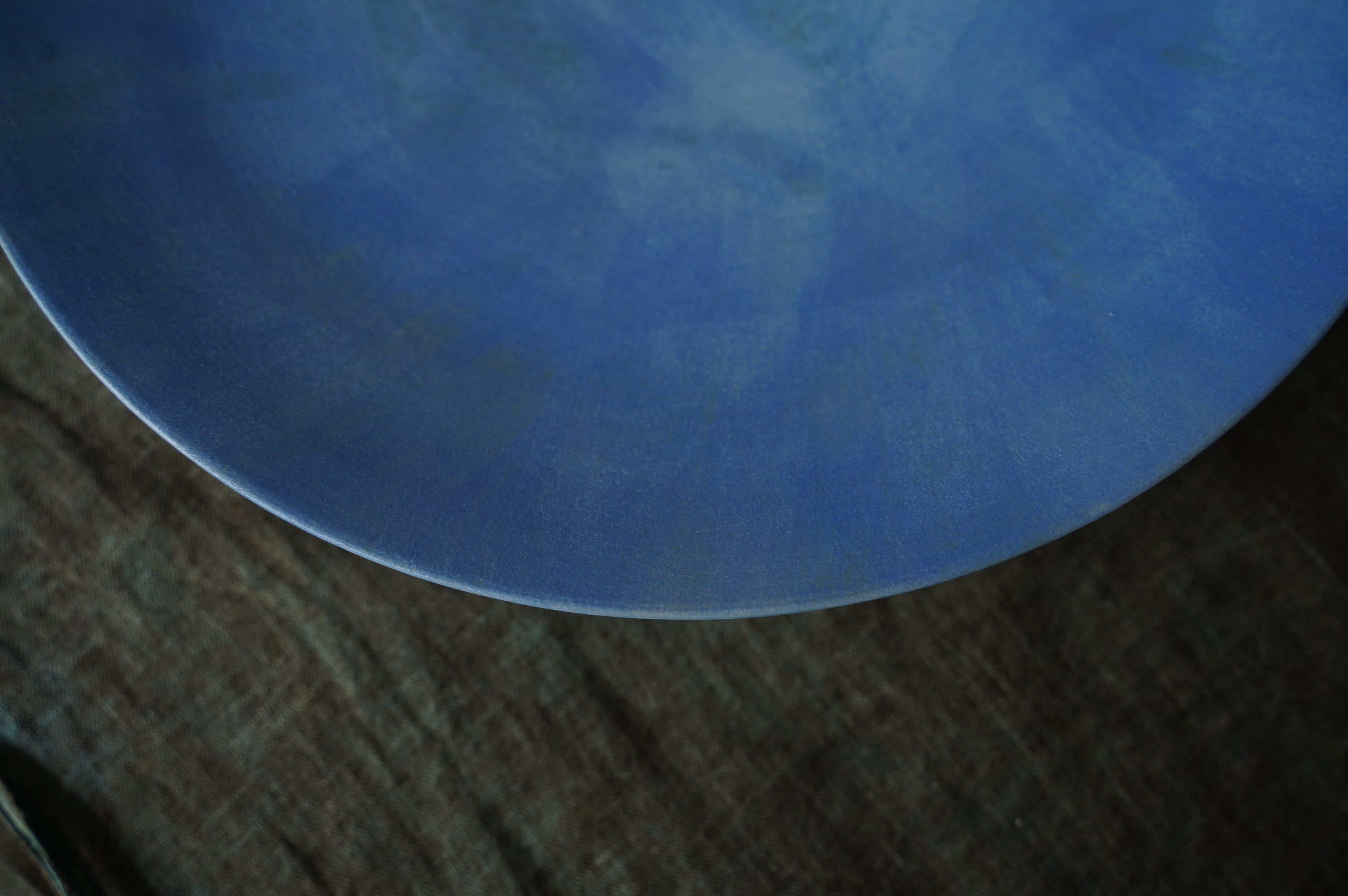 磁器の上に釉薬、化粧土、上絵を何層にも重ねることによって生み出される曖昧な色味は、陽の光によって移ろう霞がかった空のようです。