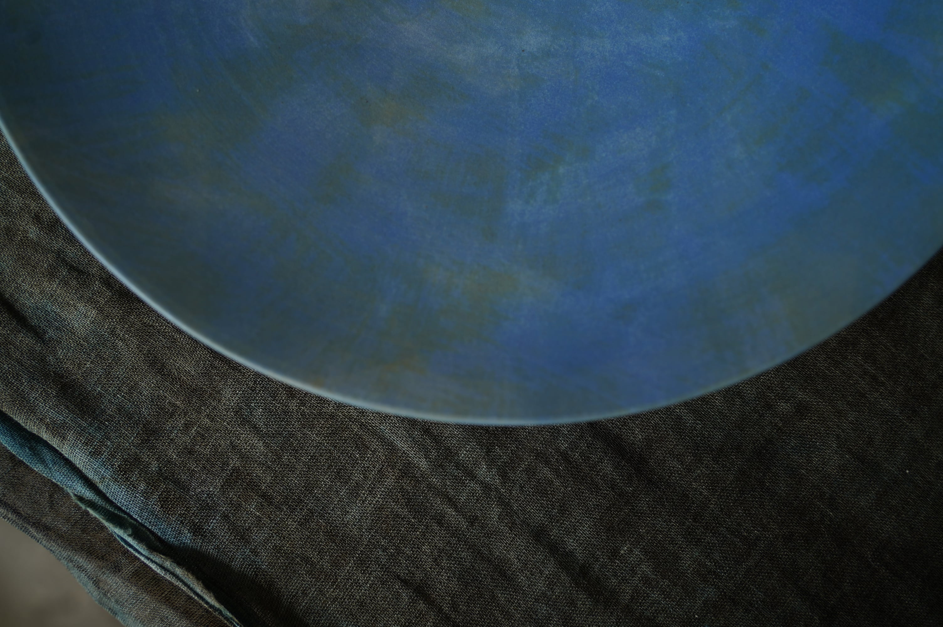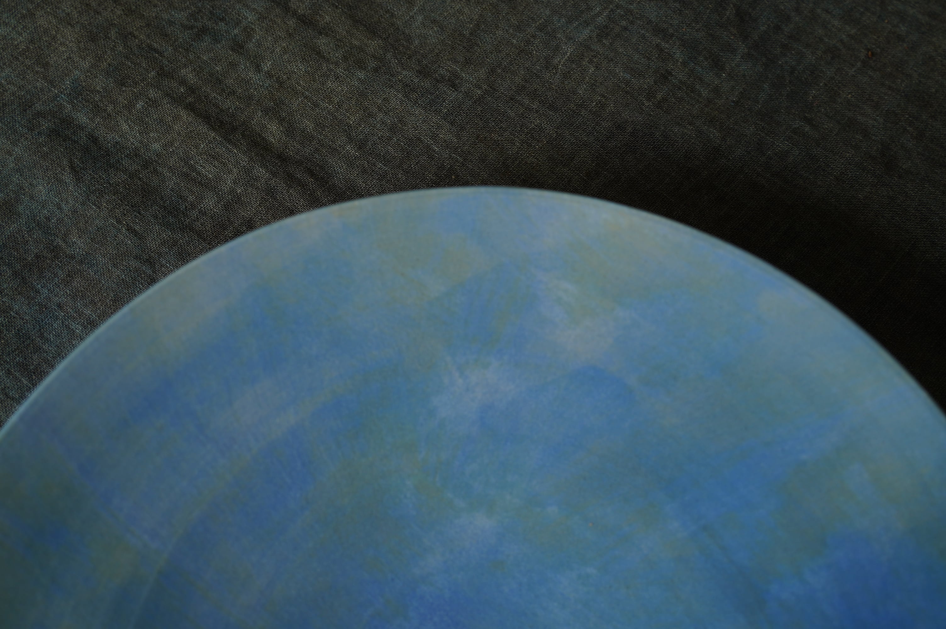 磁器の上に釉薬、化粧土、上絵を何層にも重ねることによって生み出される曖昧な色味は、陽の光によって移ろう霞がかった空のようです。
