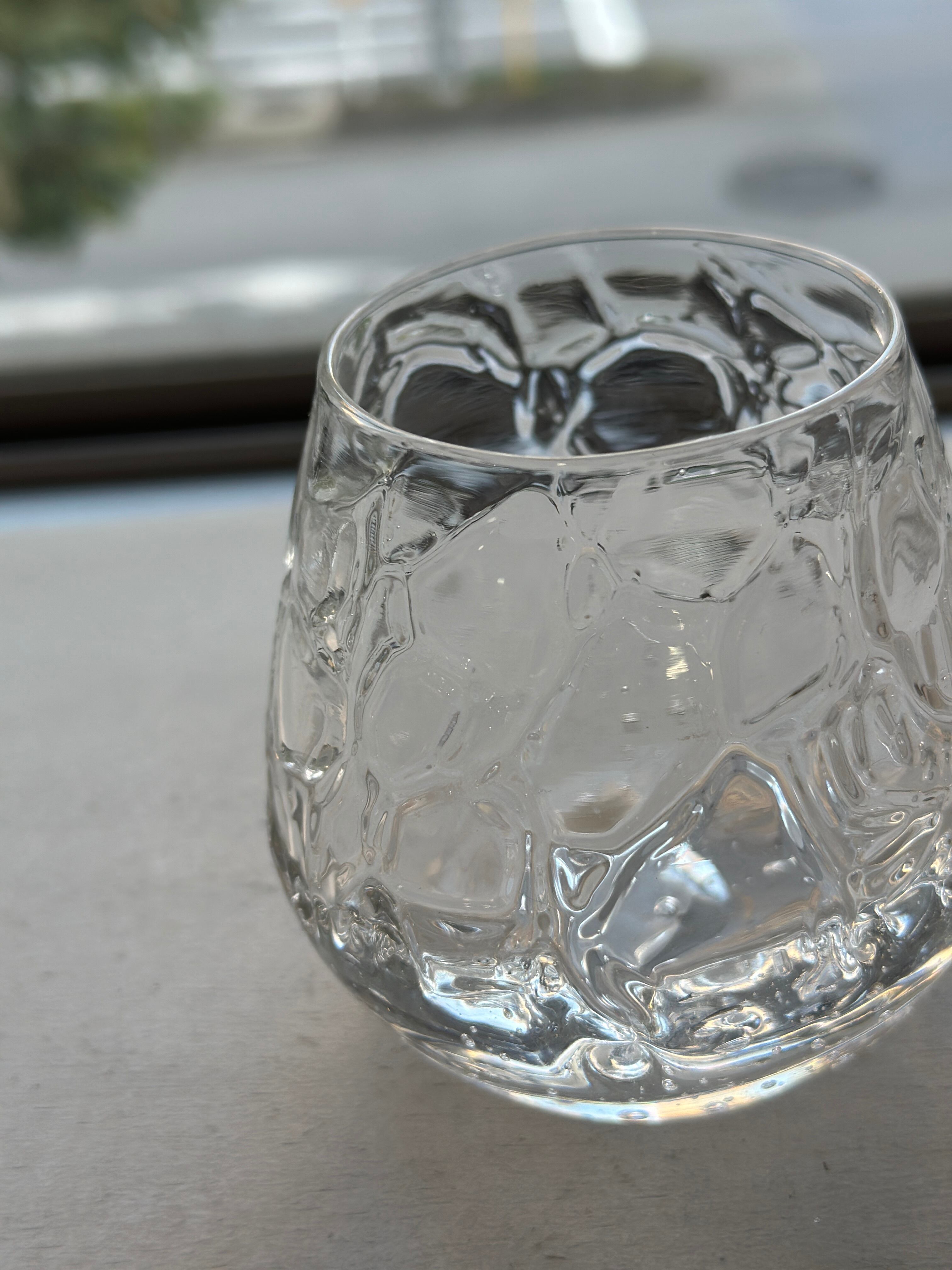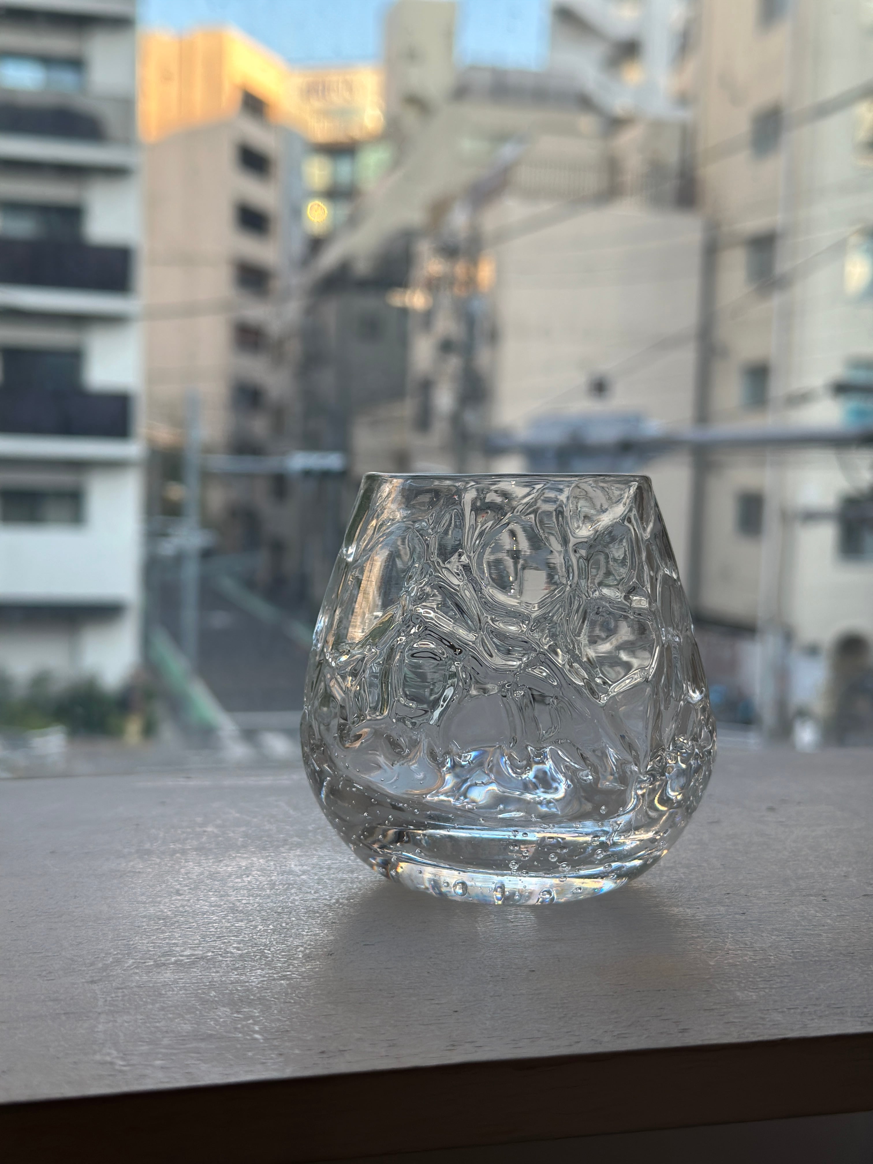 熱いガラスを水に入れ、急激に冷やすことでひび割れを起こす"アイスクラック"という技法を使って、水面を表現しています。