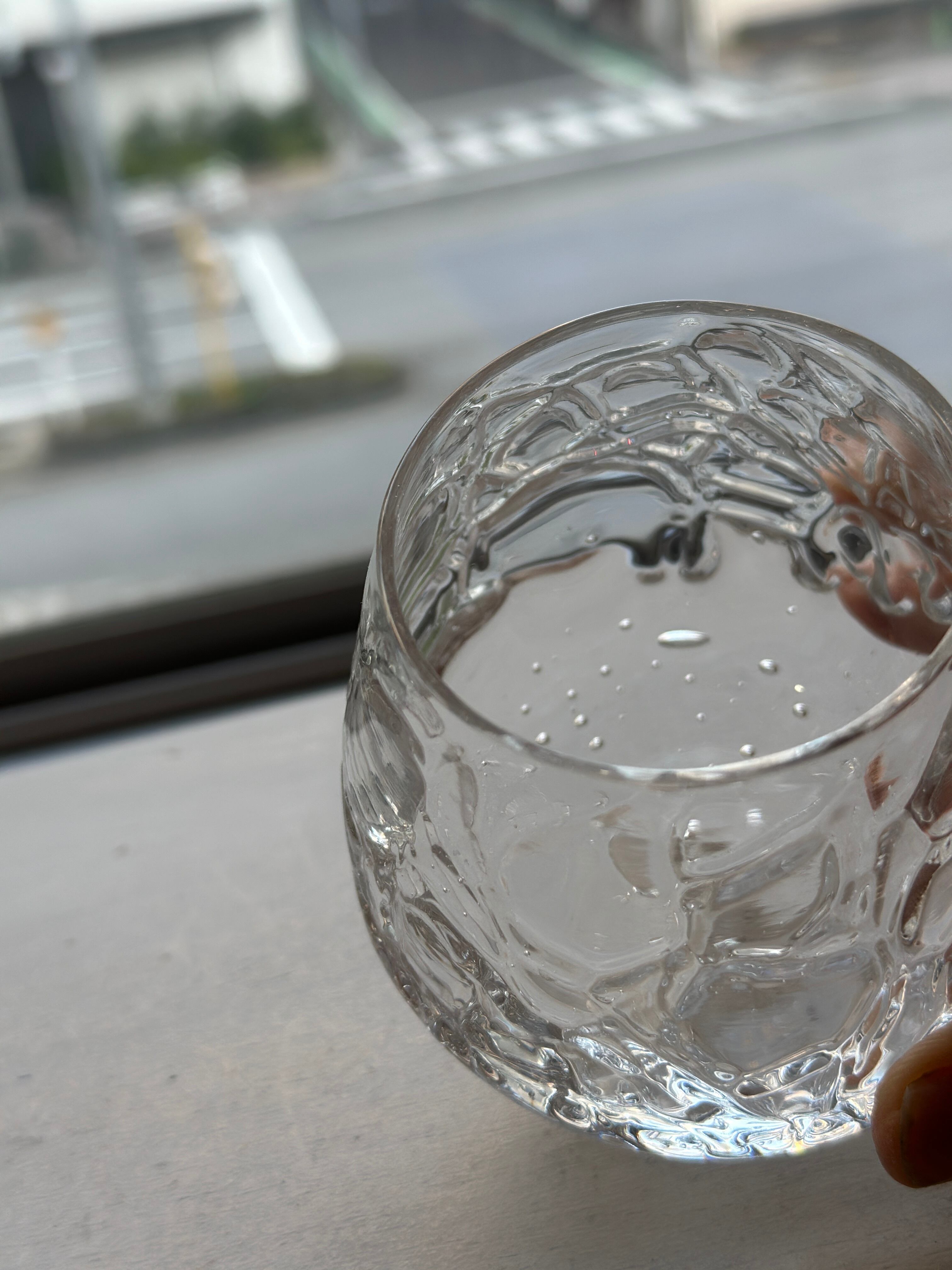 その上から別の熱いガラスを底側に巻き付けることによって、ひび割れの間の空気が閉じこめられ、泡が浮かびます。それによって水面の底から浮かぶ泡の息遣いを表現しています。