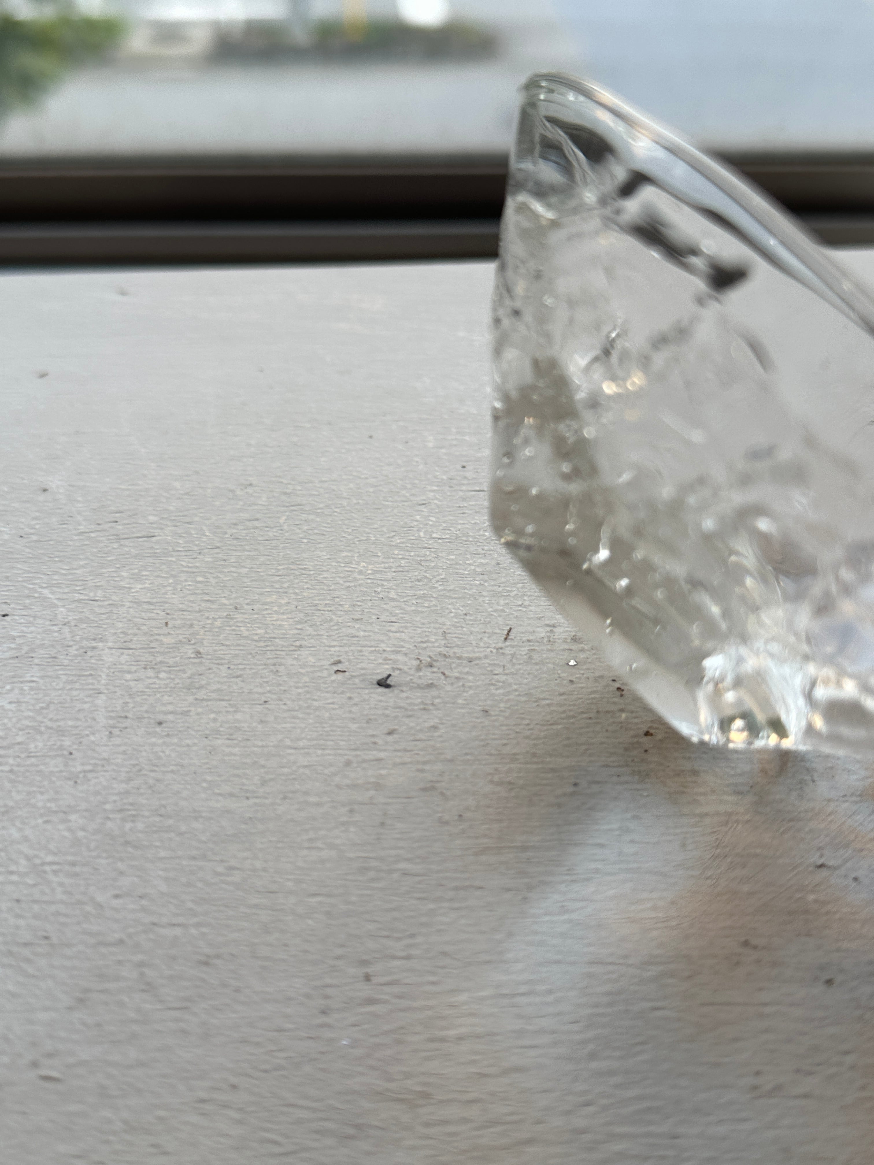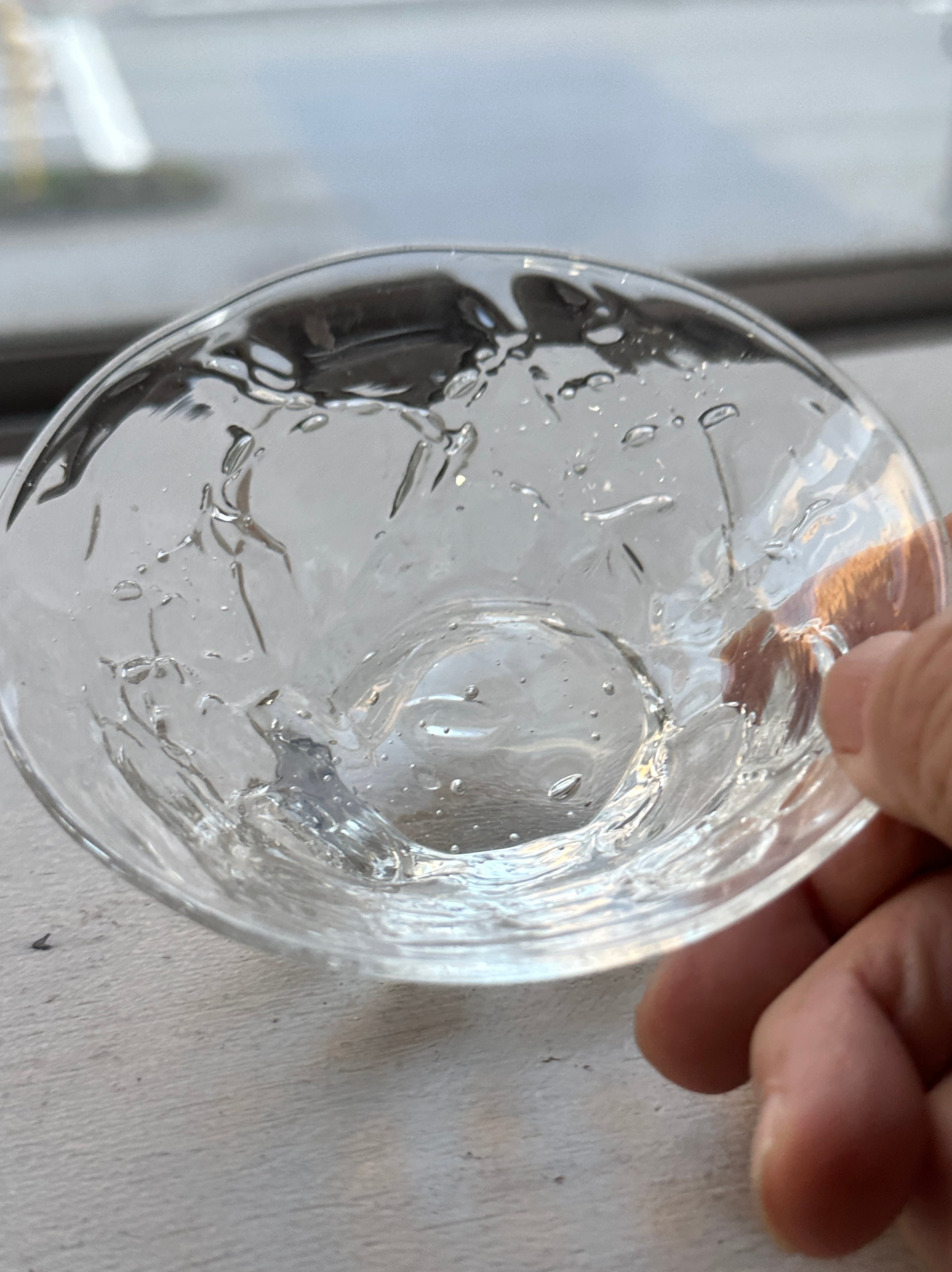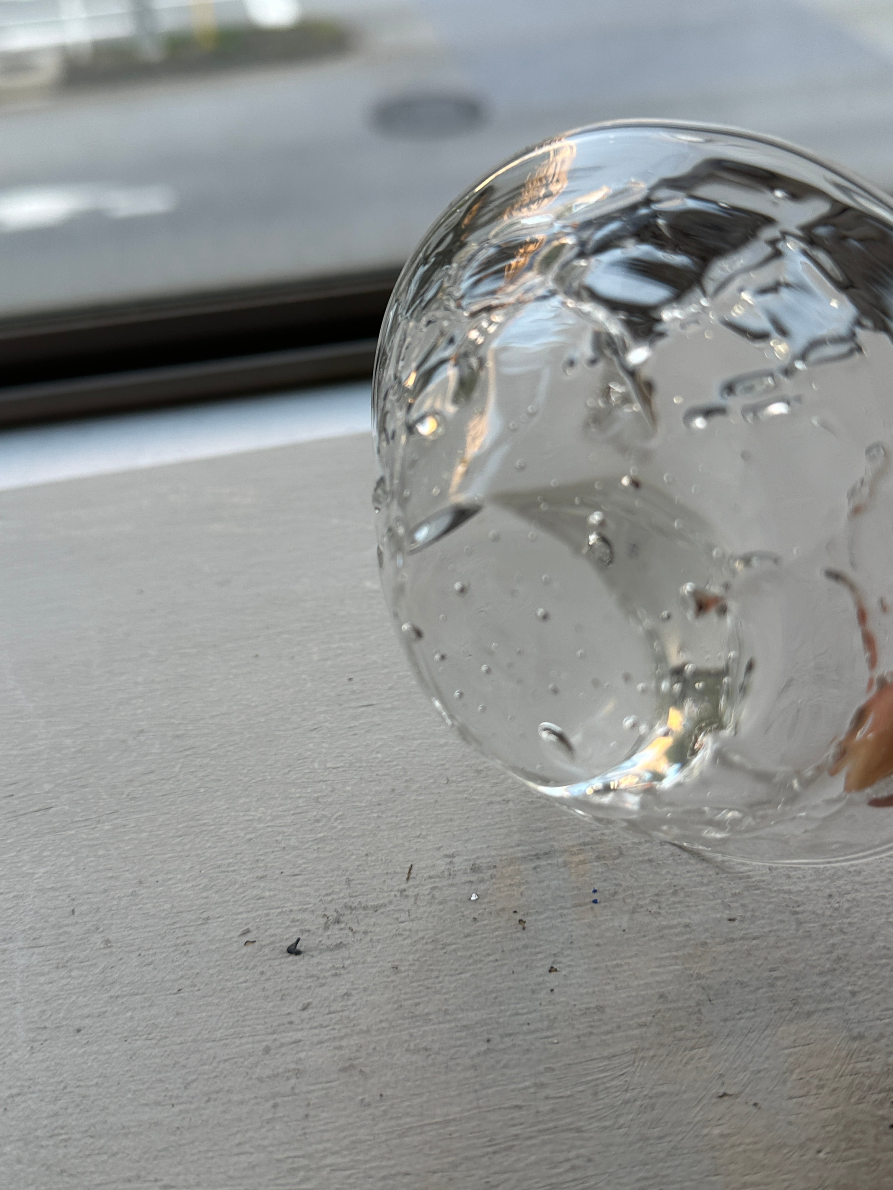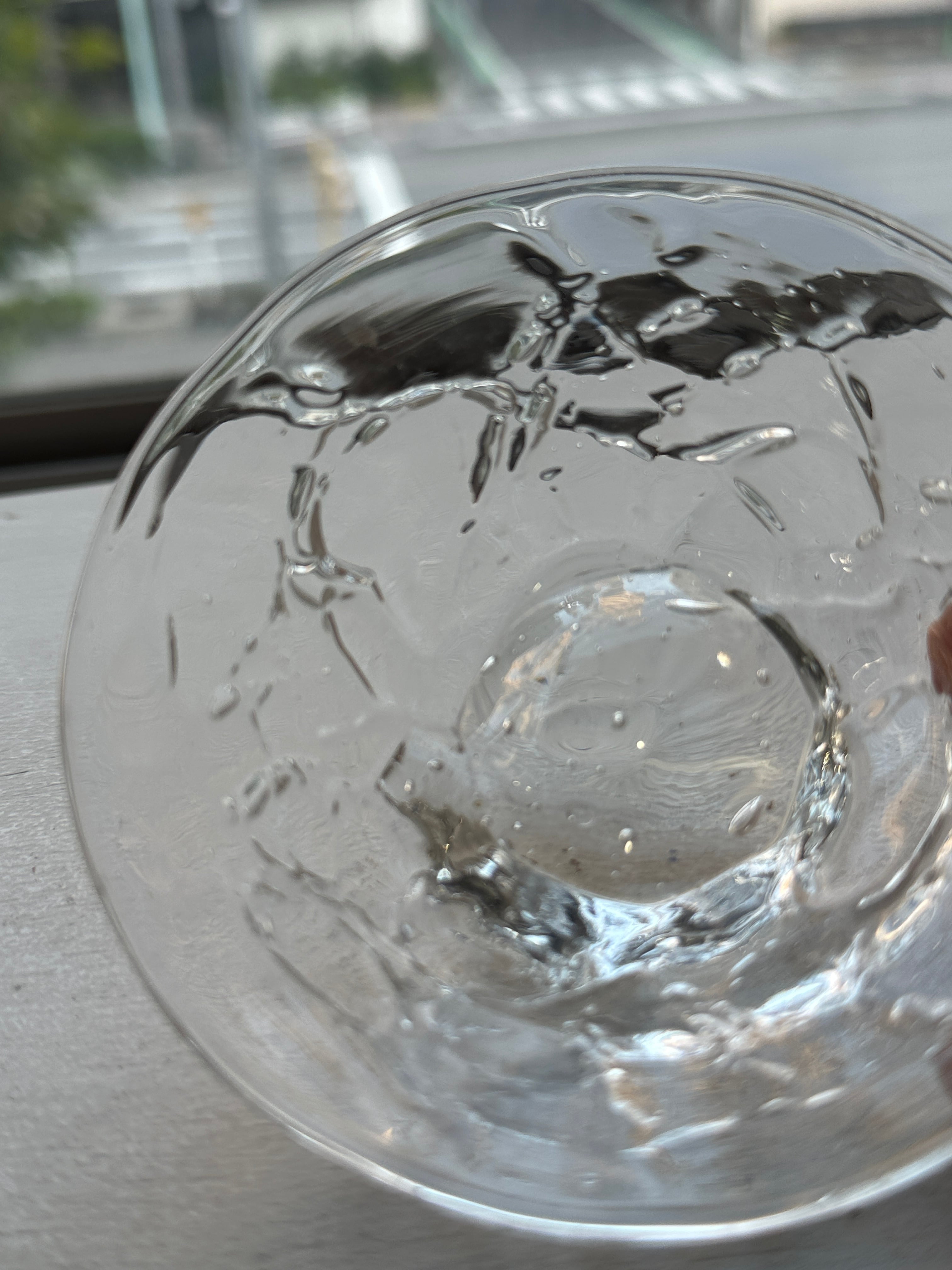 その上から別の熱いガラスを底側に巻き付けることによって、ひび割れの間の空気が閉じこめられ、泡が浮かびます。それによって水面の底から浮かぶ泡の息遣いを表現しています。