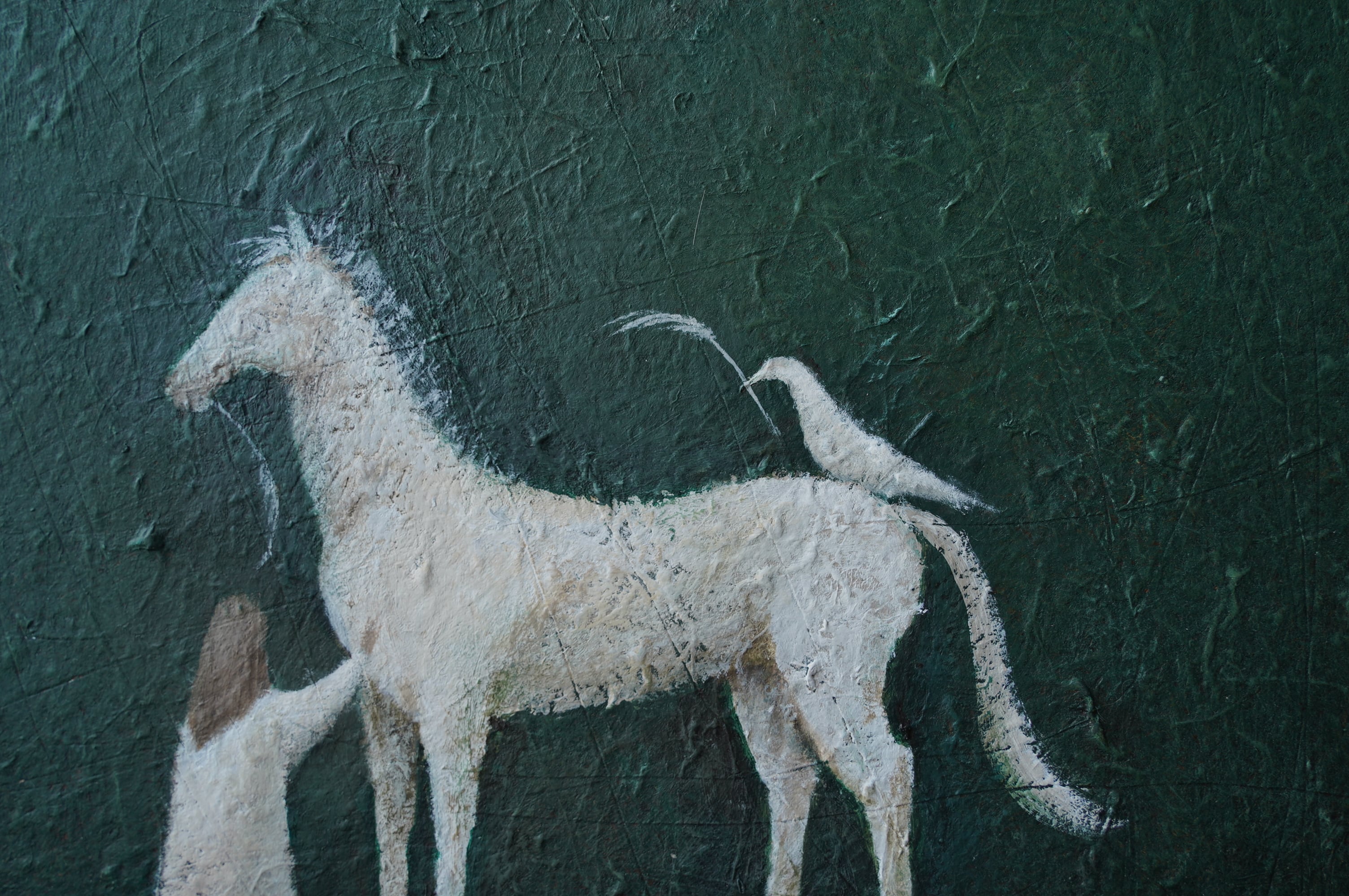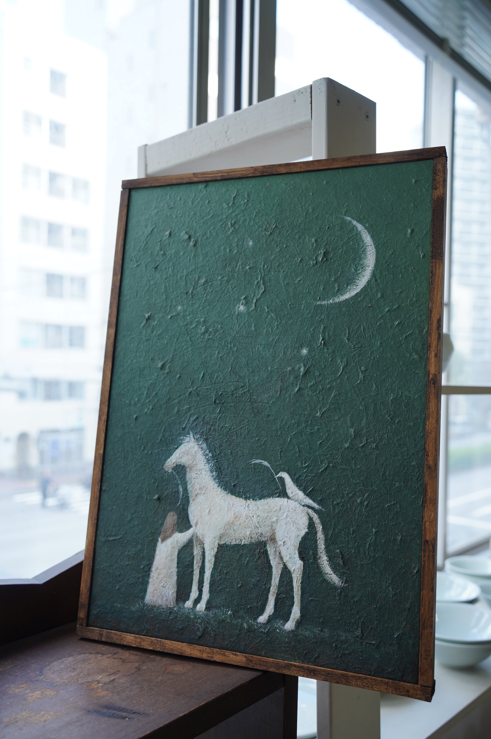 タイ産の桑の紙に色を重ね、掻き取っていくという手法で描かれる鈴木恵美さんの絵。
