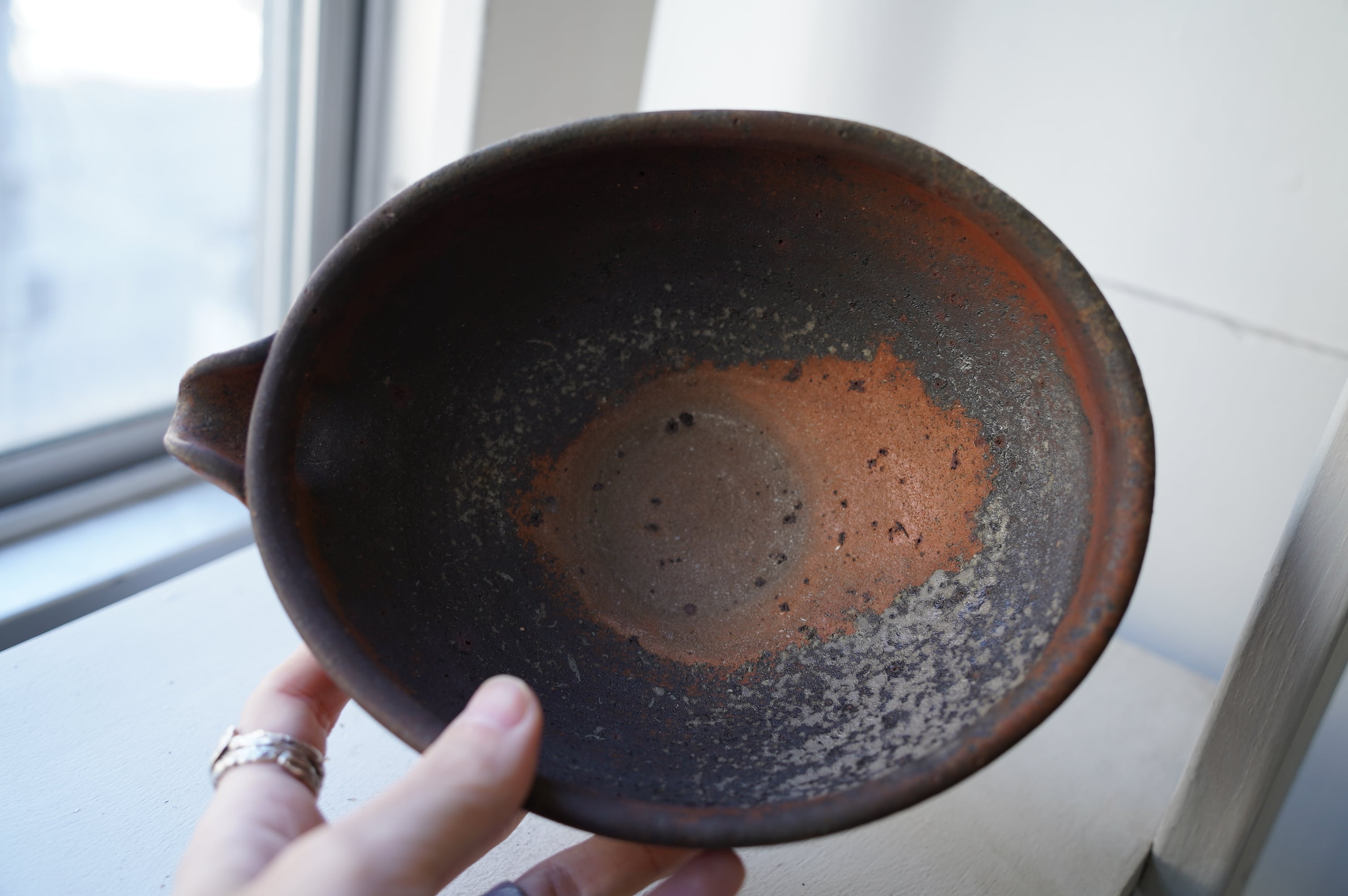 穴窯という原始的な薪窯で1週間もの長い時間じっくりと焼き上げられる作品達は固く焼き締まり、薪の灰や土そのものの表情が出ています。