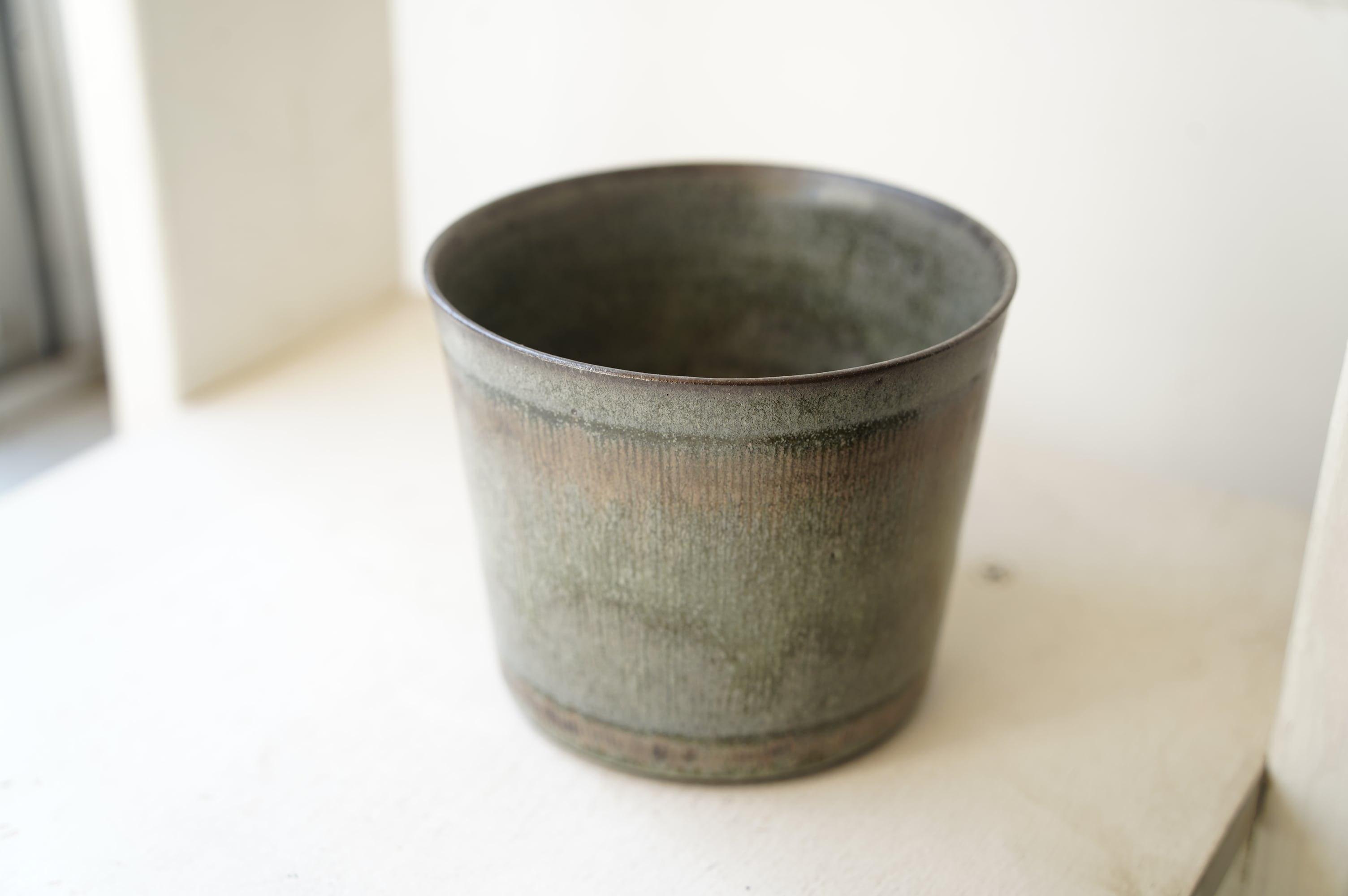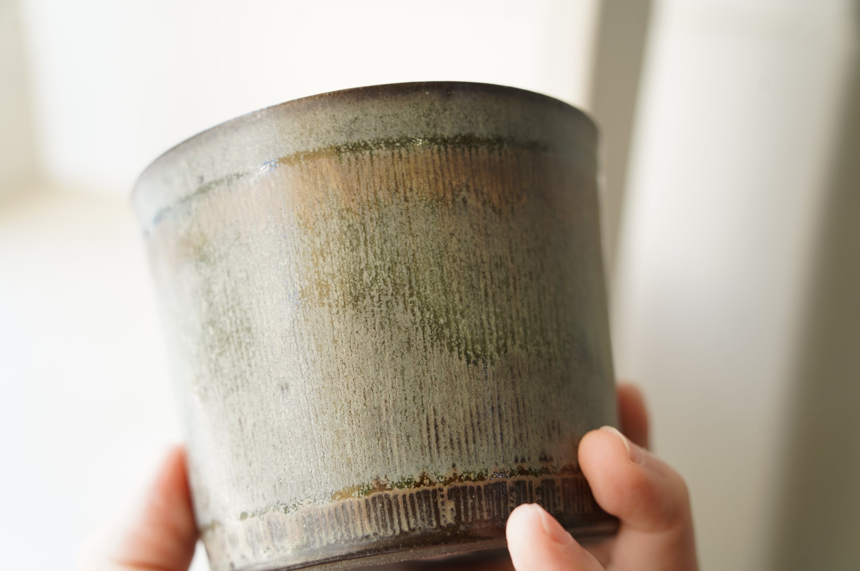 「線紋」シリーズは櫛のようなもので器に縦に細い線を彫り、上部に茶系の釉薬を埋め込み焼く事て線に沿って釉薬が流れ込みます。