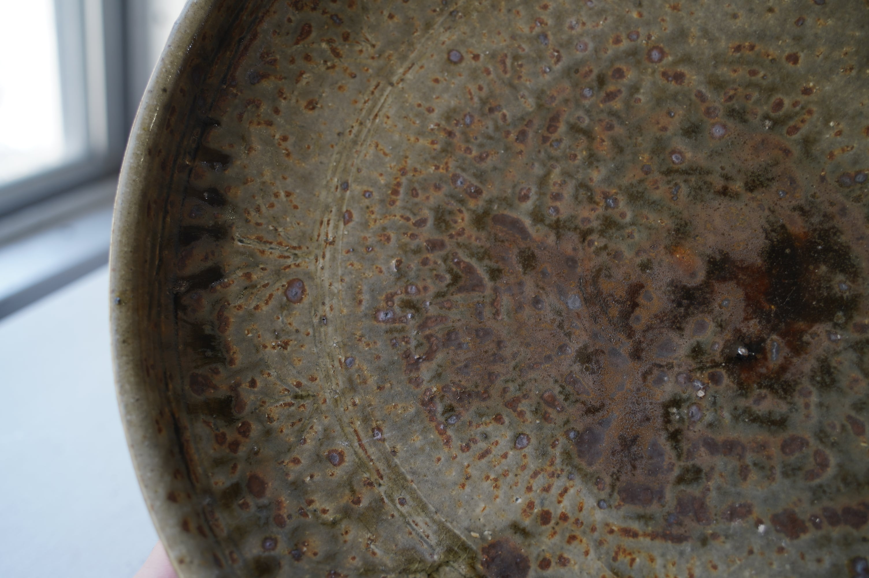 釘で模様を彫り灰釉薬を掛けています。