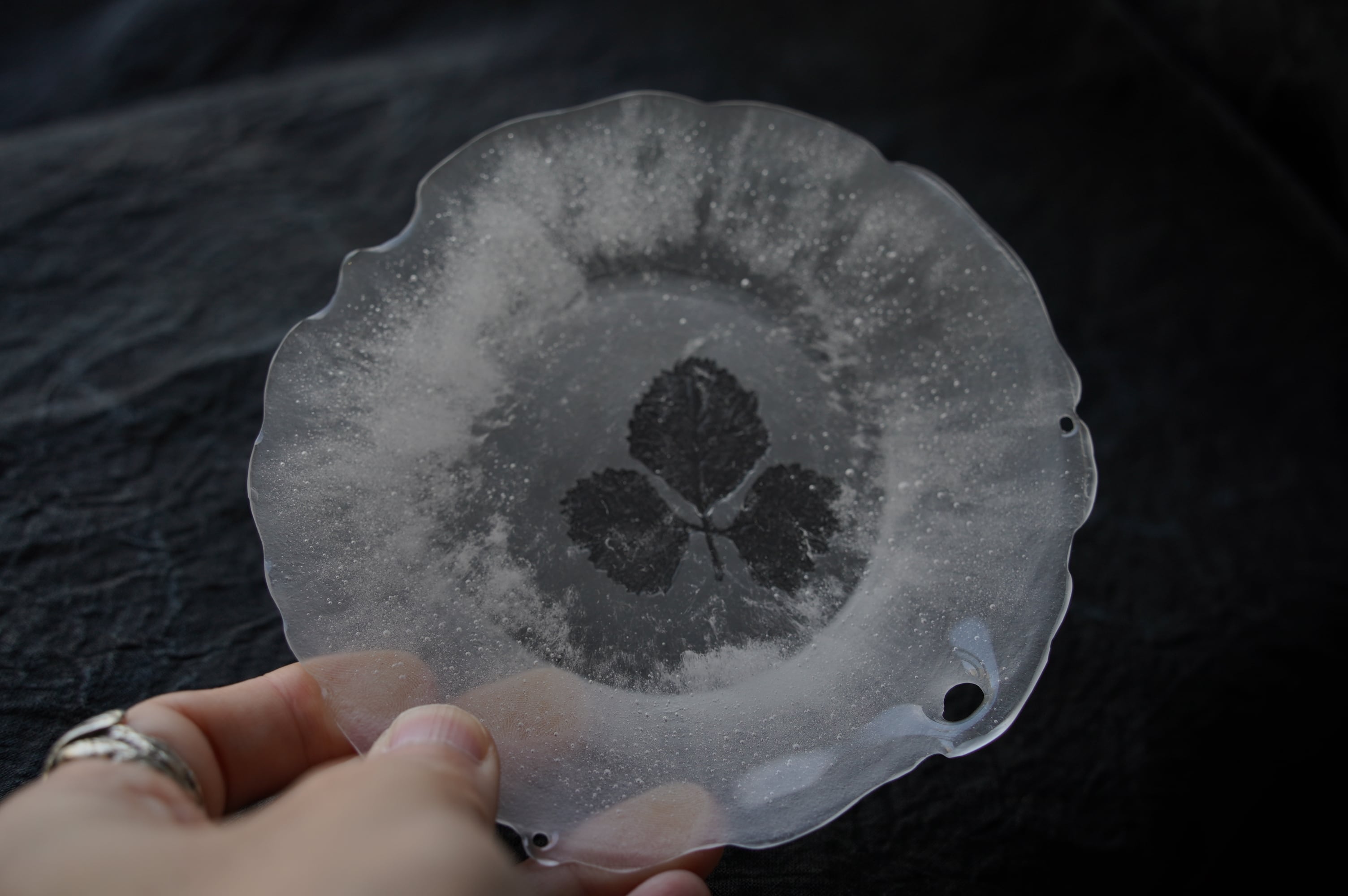 富山県で制作する王承龍さんのお皿です。 王さんは中国で建築のデザイナーとして働いていましたが、 仕事先で訪れた日本でたまたまのちに卒業することになる 富山ガラス造形研究所の展示を見て、ガラスに魅せられてしまい 奥様とともに富山に引っ越して研究所に入学しました。 2024年度に卒業したばかりではありますが、既に作品の完成度は高く 文化庁が主催する日本のガラス展にも出品しております。 四季折々の日本の葉や花びらを型に写しこみ一つ一つ制作しております 直径約12.5cm×高さ約1.3cm