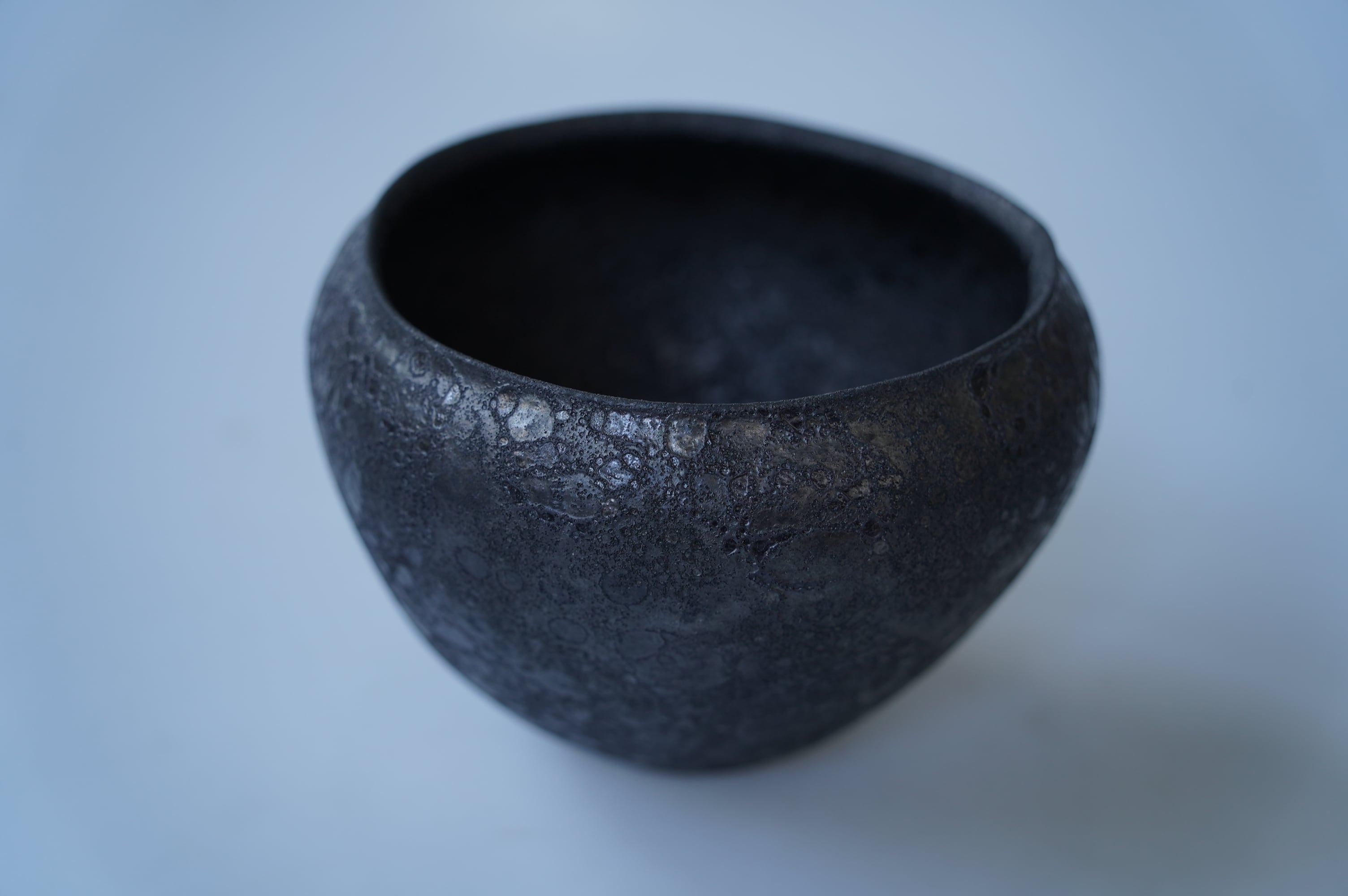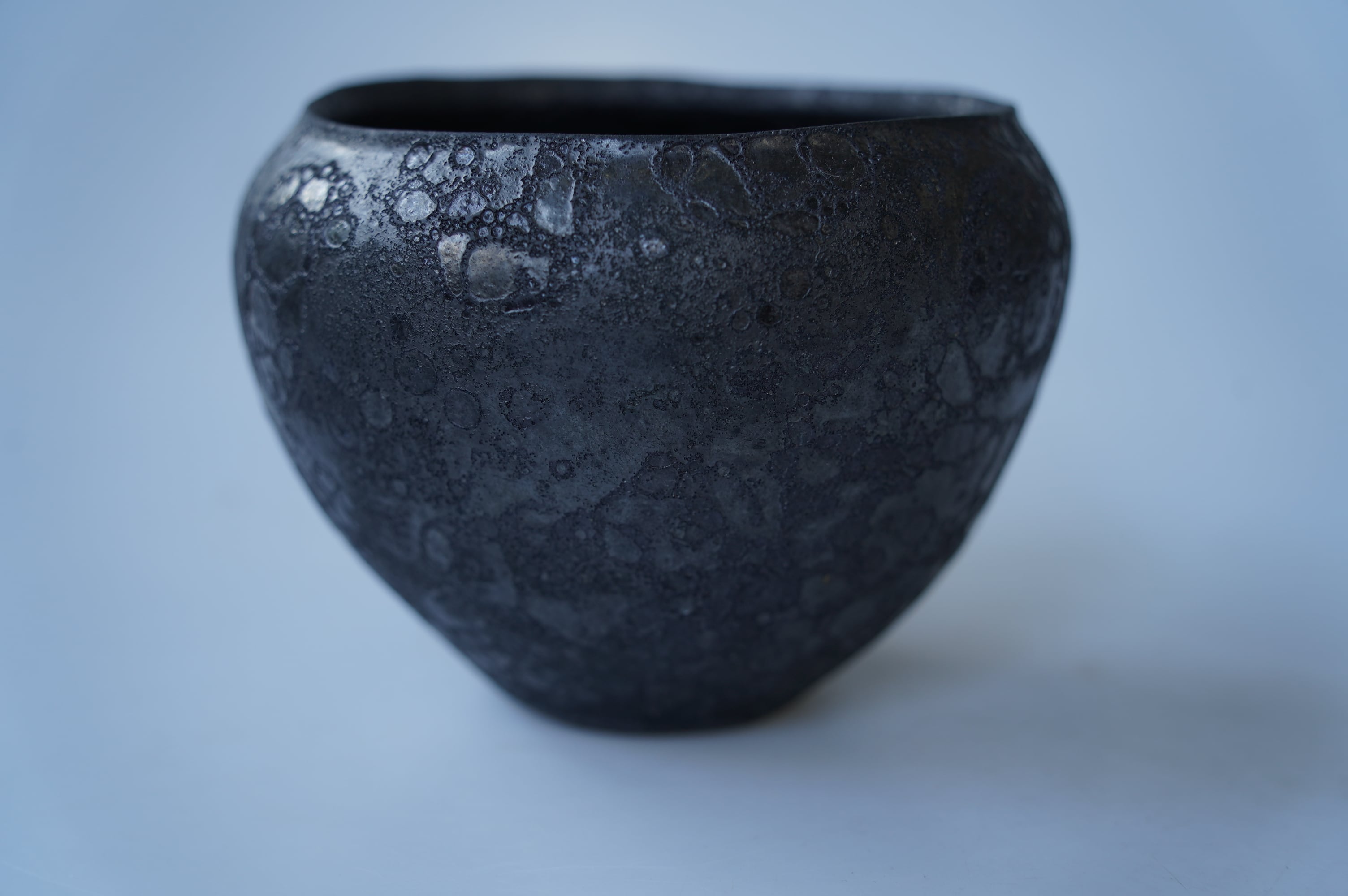 本来青く色が出るコバルト釉を調合で黒に発色させさらに発泡させています。